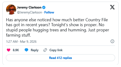 “Has anyone else noticed how much better Country File has got in recent years?” Mr Clarkson began on X. “Tonight’s show is proper.” (sic)