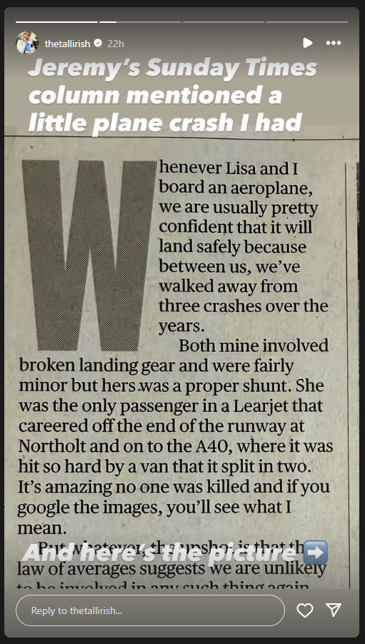 In his weekend newspaper column, Jeremy began by explaining that how between them, the couple had ‘walked away from three plane crashes over the years’.
