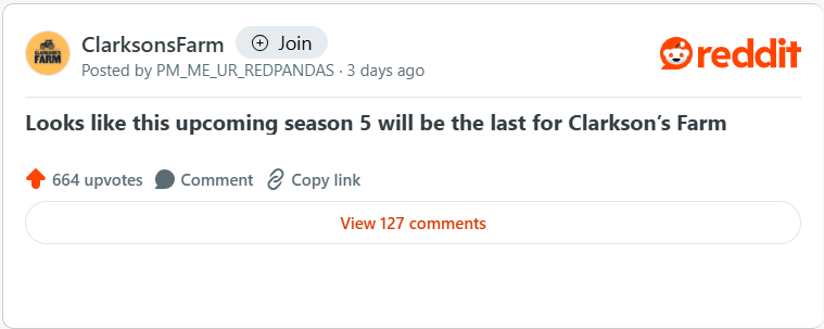 A message on the platform states: “Looks like this upcoming season five will be the last for Clarkson’s Farm,” revealing news that a spin-off series featuring cast members from Clarkson’s Farm could be under development. Whether the programme truly ends remains unconfirmed, but some supporters are preparing themselves for the finale – whilst others welcome the prospect of a spin-off series.