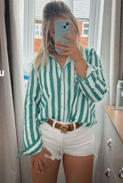 Although the young farmer had no problem getting down and dirty on the show while dressed in overalls, it appears outside of work, she is embracing a more fashion-forward look. Harriet paired the tiny white denim shorts with a trendy striped shirt and completed the look with a brown leather belt from upmarket English brand Holland Cooper.