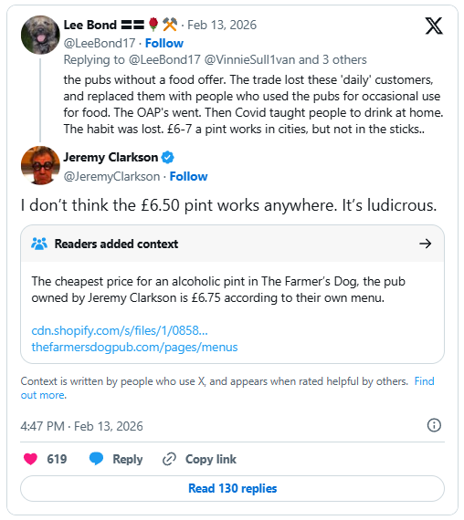 The note stated: “The cheapest price for an alcoholic pint in The Farmer’s Dog, the pub owned by Jeremy Clarkson is £6.75 according to their own menu.”