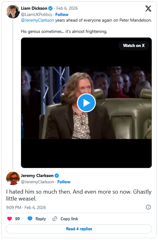 Now, Mr Clarkson has given his opinion on Mandelson, taking to the social media site X to share his thoughts on the matter.