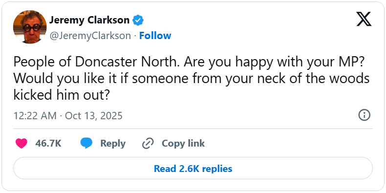 Coral spokesperson John Hill said the betting frenzy began moments after Clarkson’s provocative post on X (formerly Twitter), where he appeared to call out current Doncaster North MP Ed Miliband. Clarkson wrote: