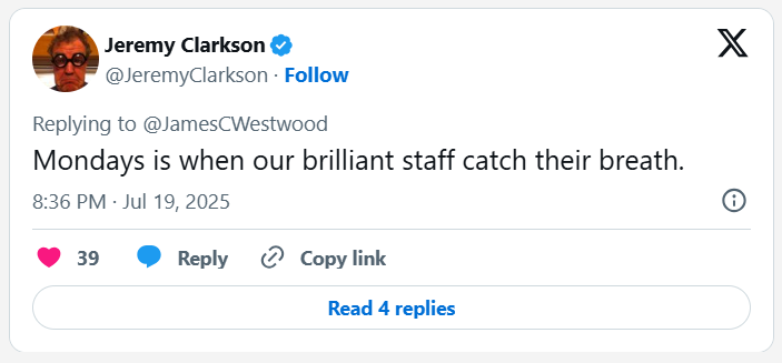 On Saturday (July 19), a fan tagged the 65-year old ex-Top Gear host on social media, enquiring: “Can you open your pub for me about six hours earlier on Monday please? I was gonna visit, but didn’t realise you don’t open till 5.”