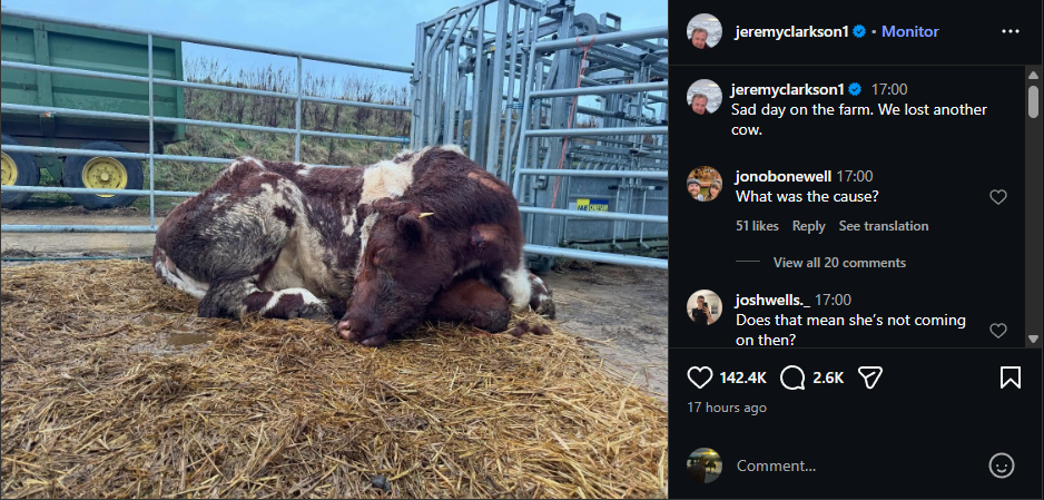 Now, Clarkson has confirmed that the situation has worsened. Posting on Instagram on Saturday, January 31, he shared an image from the farm with a brief but heavy caption: “Sad day on the farm. We lost another cow.” The understated message reflected the emotional weight of the moment, without needing further explanation.