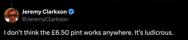 Chiming in, Clarkson wrote back: ‘I don’t think the £6.50 pint works anywhere. It’s ludicrous.’