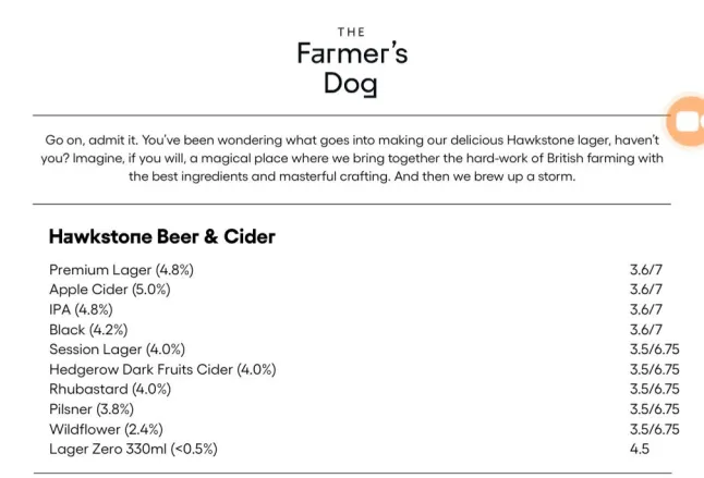 Many shared screenshots of the Farmer Dog’s menu, which boasts Hawkstone lager and confidently calls it ‘delicious’ and ‘masterfully crafted’.
