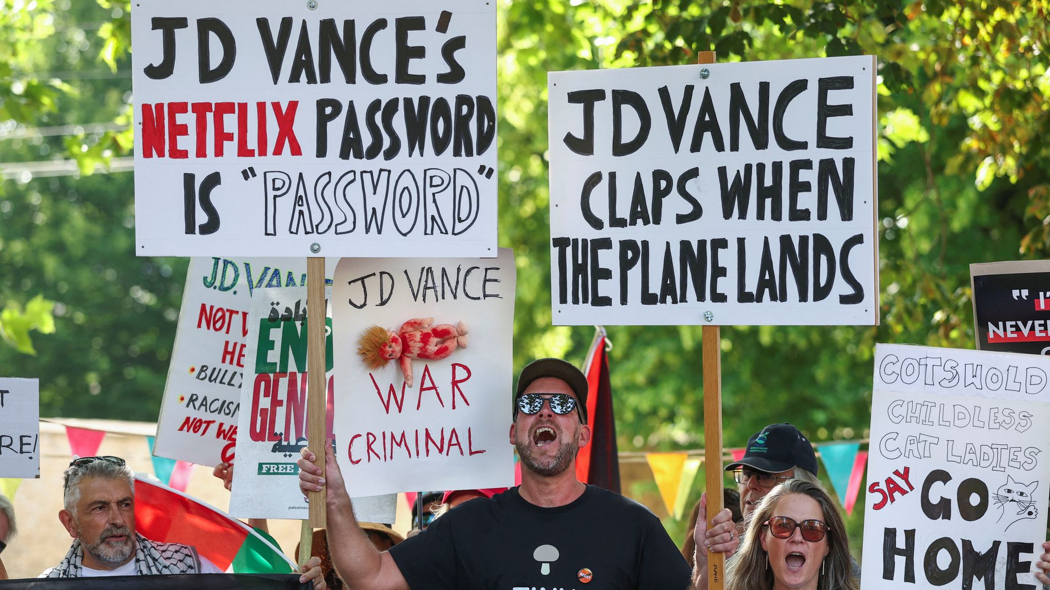 One protester in Charlbury held a banner reading “JD Vance’s Netflix password is ‘password'”, while another held a sign which said: “JD Vance claps when the plane lands.”