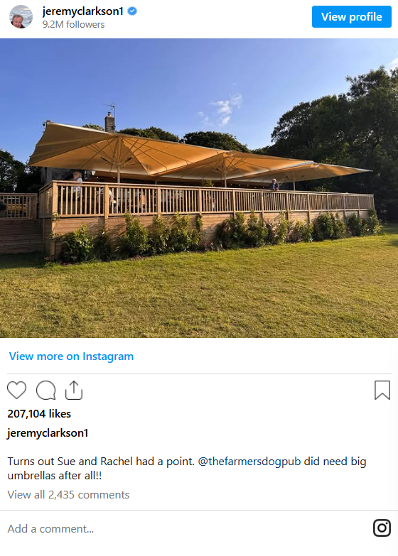 He shared a photo of the huge umbrellas covering the decking at the back of the pub on Instagram on Tuesday and wrote: “Turns out Sue and Rachel had a point. @thefarmersdogpub did need big umbrellas after all!!”