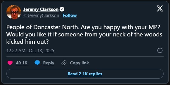 Taking to X yesterday (12 October), he wrote: “People of Doncaster North. Are you happy with your MP? Would you like it if someone from your neck of the woods kicked him out?”