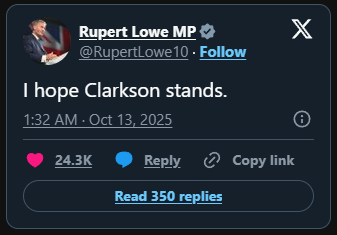 Ex-Reform MP Rupert Lowe wrote on X: “I hope Clarkson stands.”
