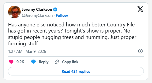 He wrote on X (formerly Twitter) Sunday evening: “Has anyone else noticed how much better Countryfile has got in recent years? Tonight’s show is proper. No stupid people hugging trees and humming. Just proper farming stuff.” A fan replied to Clarkson, 65, in agreement, as they penned: “Watching now at a friend’s after giving it a miss for years, just thinking the same.” The former Top Gear star then hit back, taking a swipe at the BBC’s presenting team as he jeered: “It’s like they’ve got rid of the idiots.” As Clarkson continued to watch the programme, his criticisms increased. In a second Tweet, he wrote: “No wait. They’ve brought climate change into it. As you were.”
