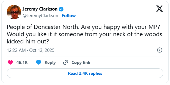Jeremy, who is from Doncaster, said: “People of Doncaster North. Are you happy with your MP? Would you like it if someone from your neck of the woods kicked him out?”