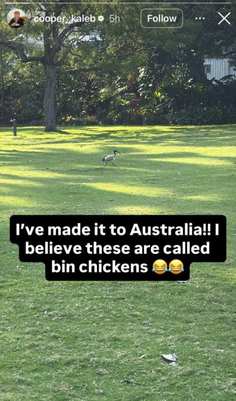 Posting to Instagram on October 23, Cooper shared a series of snapshots from his new surroundings, including one of Australia’s infamous birds. “I’ve made it to Australia!” he wrote enthusiastically, before adding with his trademark humor, “I believe these are called bin chickens,” referring to the Australian white ibis.