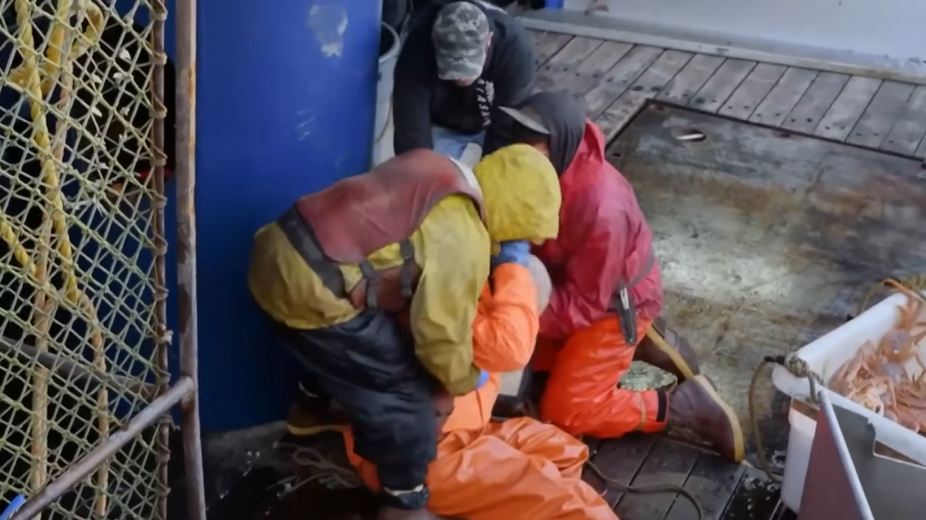 While sorting crab, Gino was struck squarely in the head by a swinging pot from the crane. “Should have got hit in the head with Gino, you okay? I can’t feel my legs,” the injured deckhand gasped, collapsing on deck. Crewmates sprang into action: “Get him off of him right now. Let’s get him inside. Careful. Real careful.”