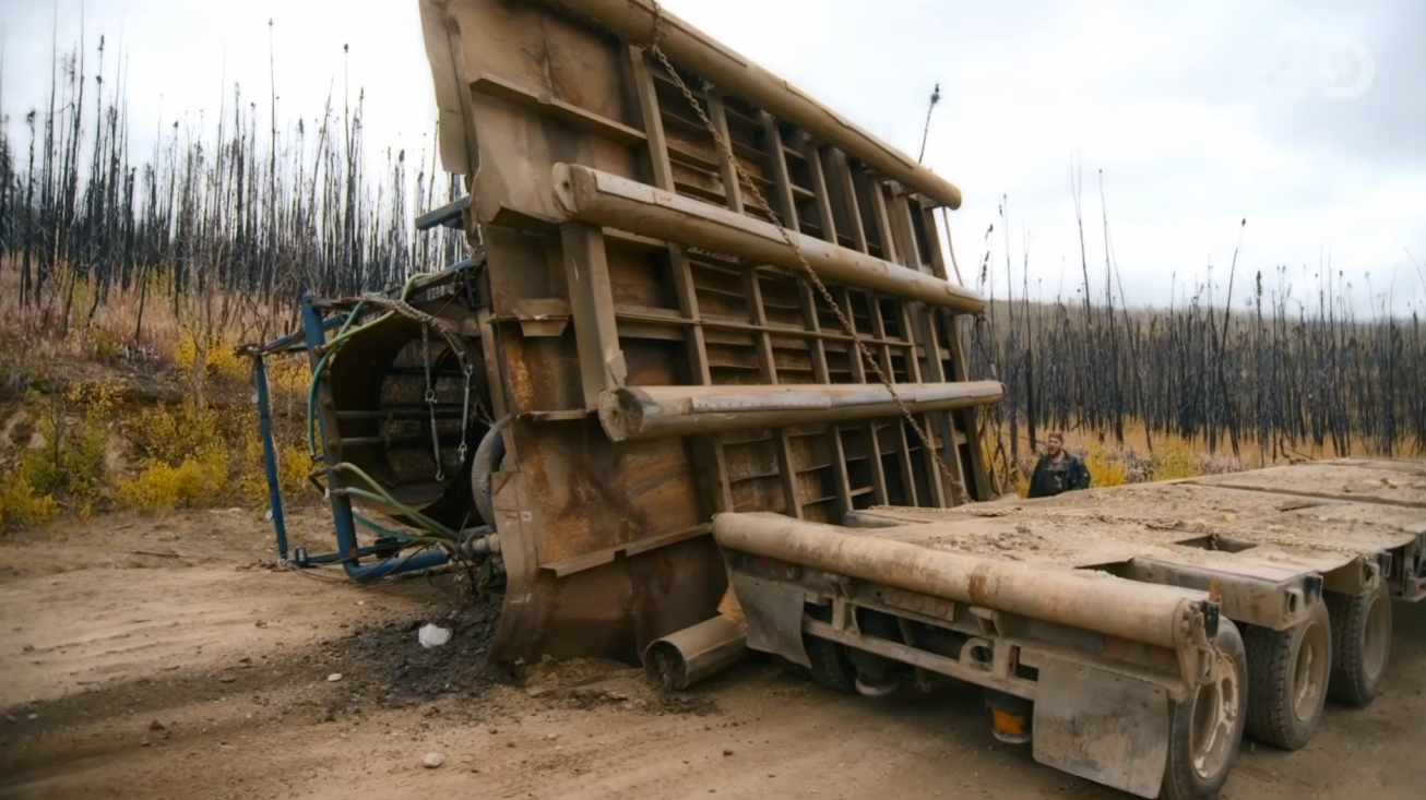 Tony’s 25-ton Kiwi wash plant was expected to be a key asset in the push for more gold at Dominion Creek. But the plan hit a major snag when the massive wash plant, dropped off by Tony’s youngest son, Mike Beats, fell off the low boy transport. A moment of tension unfolded as Mike, initially unaware of the severity of the issue, was called to get his father to inspect the damage.