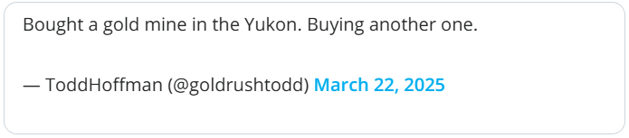However, on March 22, 2025, Hoffman took to X, where he told his followers, “Bought a gold mine in the Yukon. Buying another one.”