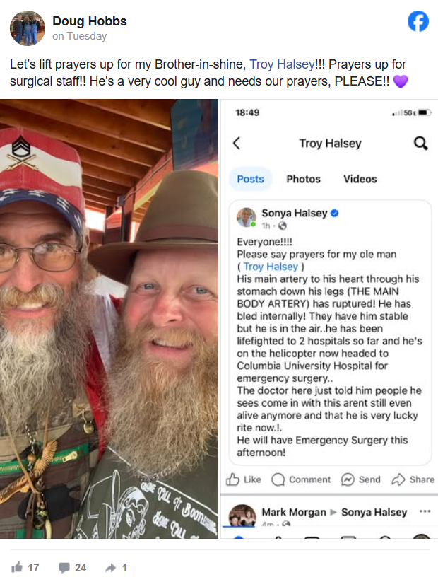 Troy’s wife, Sonya, had previously shared, “Everyone!!!! Please say prayers for my ole man ( Troy Halsey ) His main artery to his heart through his stomach down his legs (THE MAIN BODY ARTERY) has ruptured! He has bled internally!”