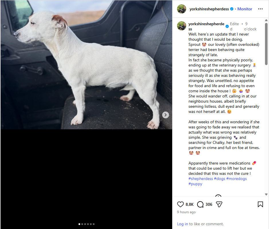 Recently, Sprout became “physically poorly” and ended up with a trip to the vets, but it turns out, she was in fact “grieving” and searching for her “best friend” Chalky.