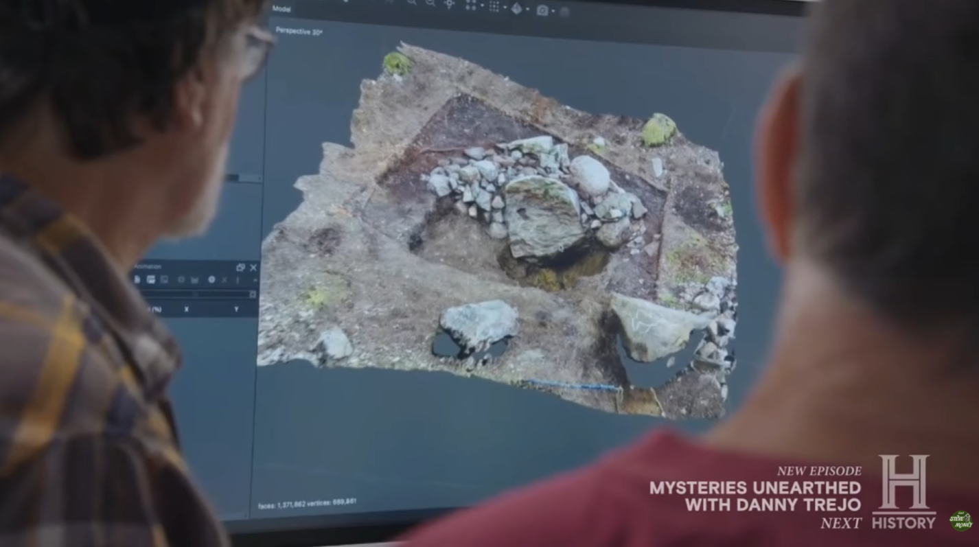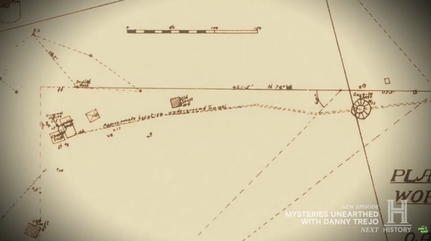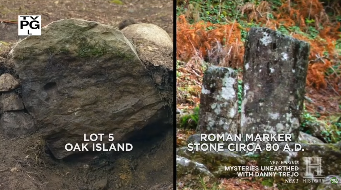 That idea led to the episode’s central field investigation. Guptill, Gary Drayton, Peter Fornetti and Ethan McArdle physically walked the projected alignment across several lots, scanning for additional markers along the route. On Lot 27, the team encountered a drilled stone — a significant find given its resemblance to drilled rocks discovered in the late 19th and early 20th centuries near the original Money Pit.