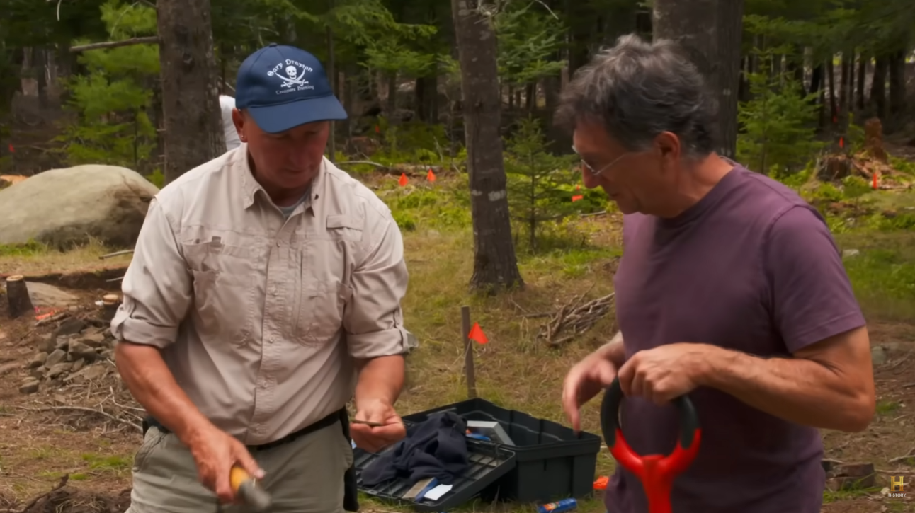During a metal-detecting sweep on Lot 25, close to the foundation of Ball’s house, Gary Drayton and Marty Lagina unearthed what appears to be part of a gentleman’s pocket knife, followed by a small copper patent plate believed to have been mounted on a musket or rifle.